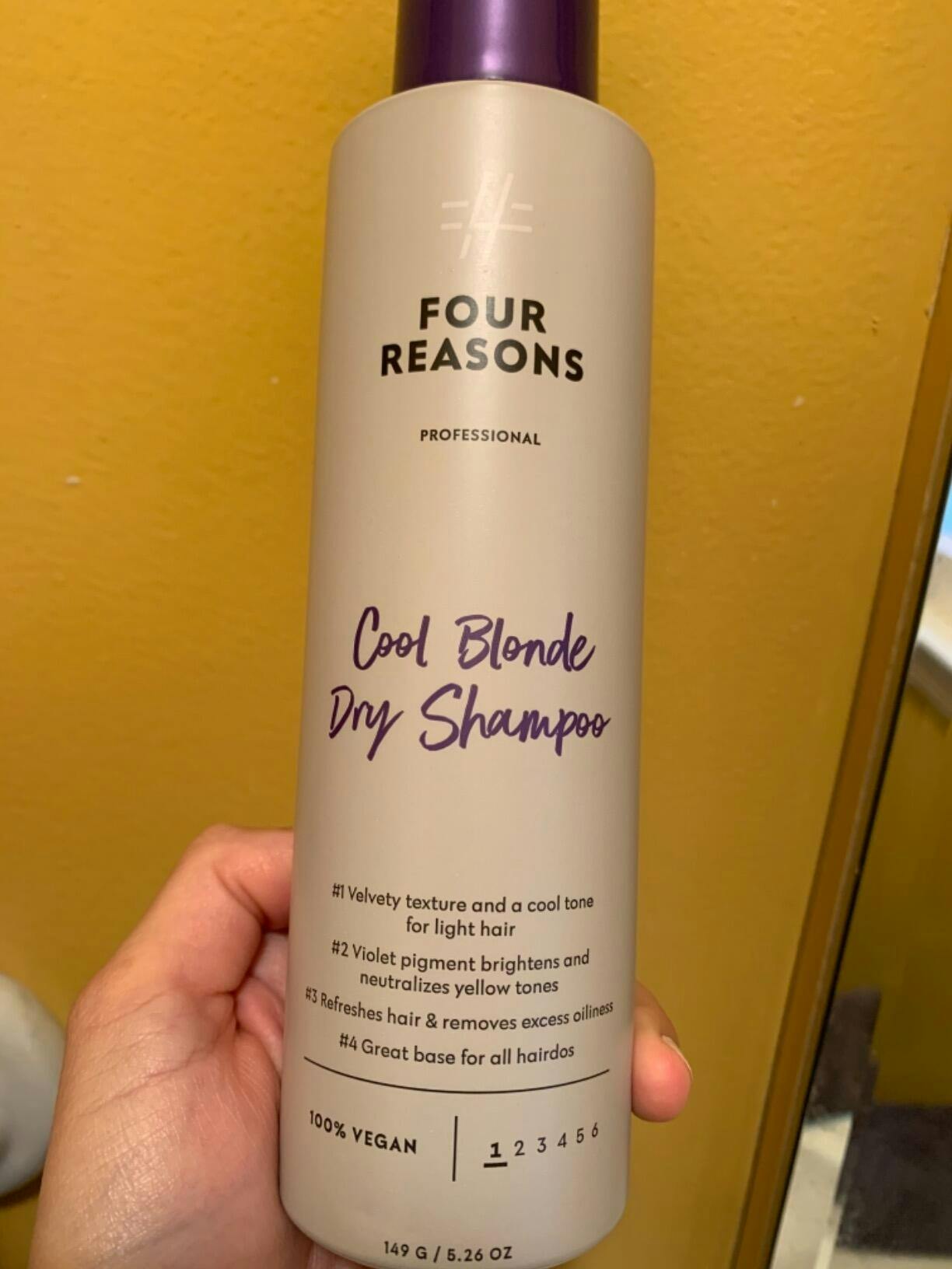 Silvery hair powder that blends well with blonde and grey hair while subtly neutralizing warmer tones from hair. Gives hair a velvety finish, lightness and structure, and forms a base for hairstyling while providing body and lift to the roots. Absorbs excess oiliness from the roots. A must-have product for all blondes! Four Reasons Professional Cool Blonde Dry Shampoo is a professional-quality product created from the best ingredients. It has a vegan formula and recyclable packaging.